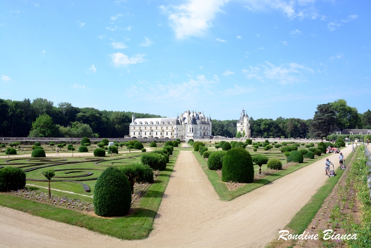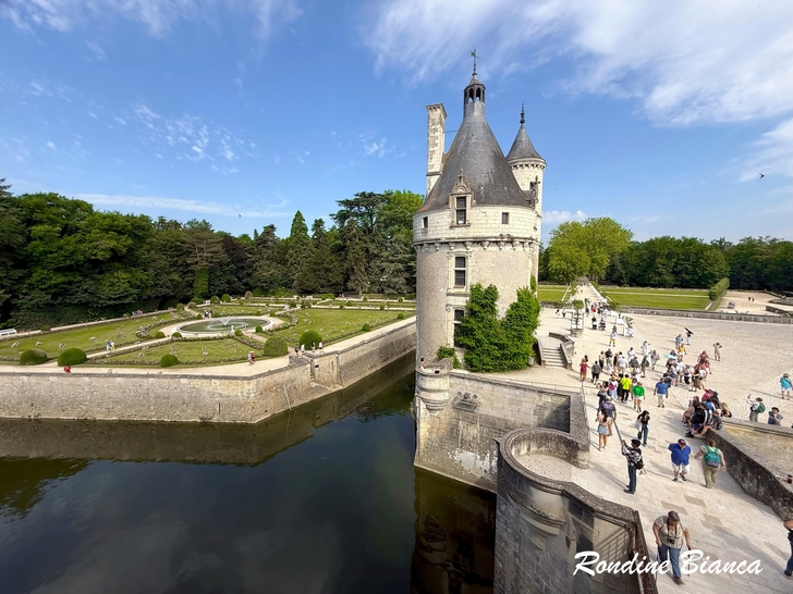 由雪儂梭城堡二樓陽台俯瞰,前方兩個花園彷彿漂浮在護城河之上,凱瑟琳花園(下圖左)及黛安娜花園(下圖右),分別坐落於侯爵塔兩側,侯爵塔是建造現在城堡之前的防禦工事遺跡。