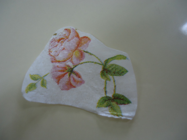 1.將餐巾紙圖案剪好備用 ( 剪好所需要的面積用量即可 , 初學者剪小面積, 比較容易成功, 成品也會比較漂亮)...(白底的圖要剪到超過一點邊邊比較不怕上膠時破損 .有色的圖案要貼著圖邊剪)