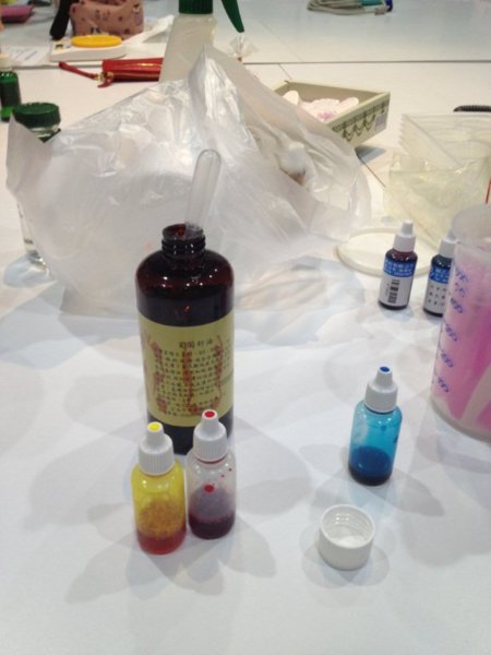 2 加入基礎油, 精油 及染料將白白的粉變色, 一般染色顏料是紅, 藍, 黃.. 需要七彩色由三原色調出來, 克莉絲直接做浅藍色(顏料越多滴顏色越深..), 許多人一起做可交換顏色