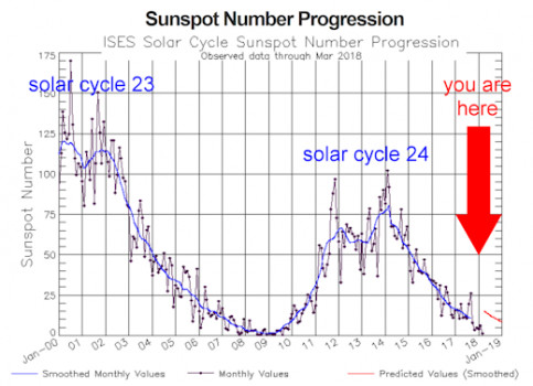 太陽黑子是在太陽光球層上發生的太陽活動,為太陽活動中最明顯、最顯見的活動現象。不過,美國國家航空暨太空總署(NASA)於2018年 10 月 2 日公佈「太陽動態觀測衛星(SDO)」所拍攝到的太陽影像,指出太陽表面再度出現「無黑子」(Blank Sun)現象,這已是2018年第 4 度觀測到太陽出現無黑子情況。科學家警告,目前為近一萬年以來,太陽活動最急速下降的時期,而太陽活動的極小期可能導致地球「小冰河期」來臨,且最快可能就在 2019 年底前發生。