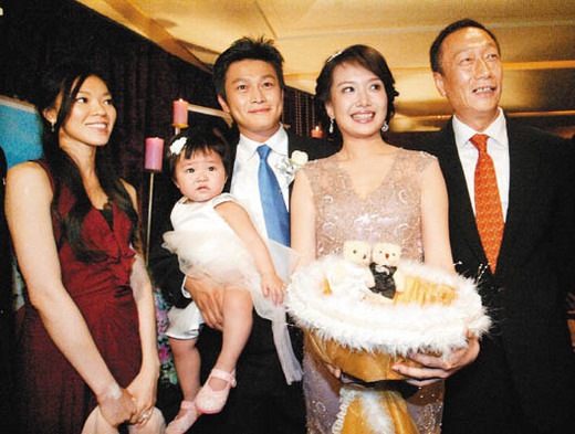 郭董擔任婚禮證婚人,在致詞時幽默說:「丁靜怡2006年到四川臥龍採訪抱過熊貓,所以他們夫妻會團團圓圓,我幾個星期前也到四川抱過熊貓。」言下之意,似乎他也希望能跟新人一樣。此話一出立即贏得熱烈掌聲。坐在主桌的曾馨瑩宴席進行中,眼光始終沒有離開郭董,甜甜微笑,幸福寫在臉上。