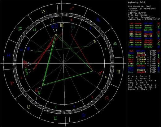 另外筆者詳細檢查星曆發現,2012年3月有個特殊大三角吉相,冥王星2012年一整年都在摩羯座7~9度,木星於2012年3月正好在金牛座7~13度,火星則是在處女座14~5度逆行,所以2012年3月中旬會出現冥王星木星與火星大三角,尤其是3月16日更是奇特,當日金星也與木星合相,月亮也與冥王星合相。2012年3月正巧是台灣總統大選投票月。