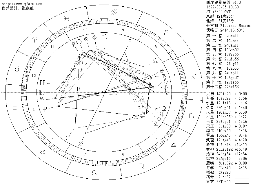 茲根據2003年大地出版社出版之宋美齡專書第一頁記載,1899年3月5日,上海虹口...傳來洪亮的嬰兒哭聲,致於生時是筆者根據命理反推,婚神星居第7宮,太陽10宮,起始宮為雙子座..