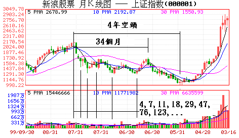 以2001年6月的2341點為座標,2341點後4個月有一明顯底部,7個月見一中期底,11個月又見一重大轉捩點,18個月、29個月、34個月、48個月(4年)後又分別見重大轉捩點!盧卡斯數允許誤差一個月!