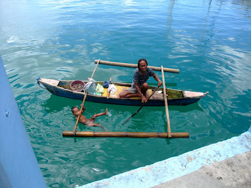 這裡有個很特殊,從沒見過的海上乞丐,向著碼頭上的遊客祈禱著