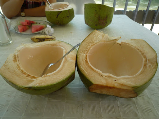 跟台灣不同的是,當地居民不喝椰子水,而是把椰子水倒掉後,剖開椰子挖裡面的椰肉吃