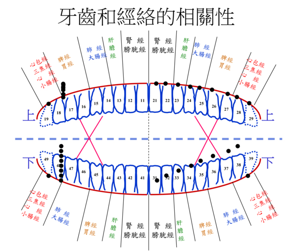 從這張牙齒和經絡的對應地圖來看,門齒對應腎經和膀胱經。犬齒對應肝經和膽經。上顎的前小臼齒對應肺經和大腸經。上顎的後小臼齒對應脾經和胃經。下顎的前後小臼齒對應的經絡剛好相反。上下顎的大臼齒對應心包經、三焦經,心經和小腸經。