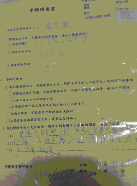 急診部的醫生先幫吳仁欽做消毒,還打了一針破傷風。他認為,斷的地方是手指的末端,要想完全恢復的機率不到10%。有很高的比率會引發敗血症或細菌感染。一旦發生這些感染現象,就只有截肢。如果不斷感染,就會截去更上面的手臂,終至成為獨臂人。吳仁欽聽了這位醫師的警告,知道醫生在這方面能做的事不多。可是他非常堅持要把斷指接回去,醫生拗不過他的要求,心不甘,情不願的幫他做了縫合手術。也要他立下手術同意書,在這件同意書上,特別注明,這個手術是患者要求的,成功率極低,一切後果,都由患者自行負責(見圖一)。