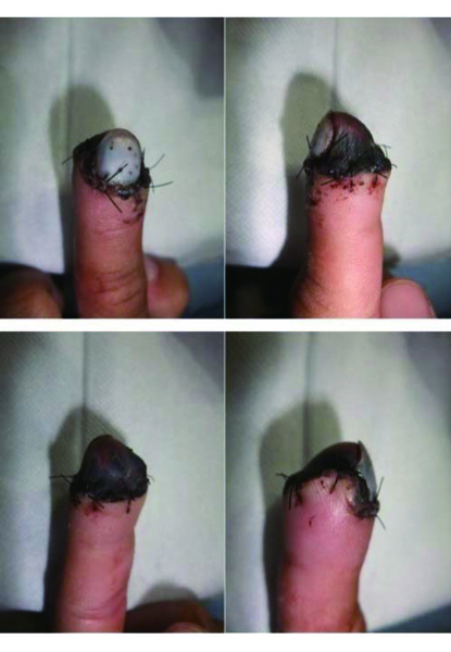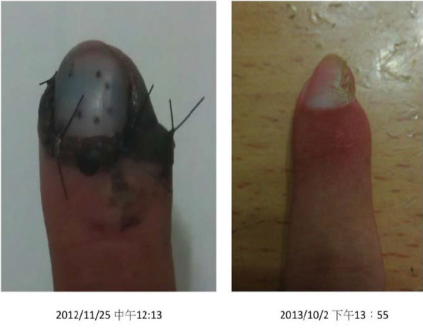 到了民國102年(2013)2月,也就是3個月後,吳仁欽發現,原先斷掉的那一截手指,變成了一層黑色的外殼,逐漸脫落。裡面重新長了一截出來。由於當初新光的醫生在縫合時做得不正,新長出來手指節也就長得有點歪。而且也小了一些。請看圖三、圖四和圖五。