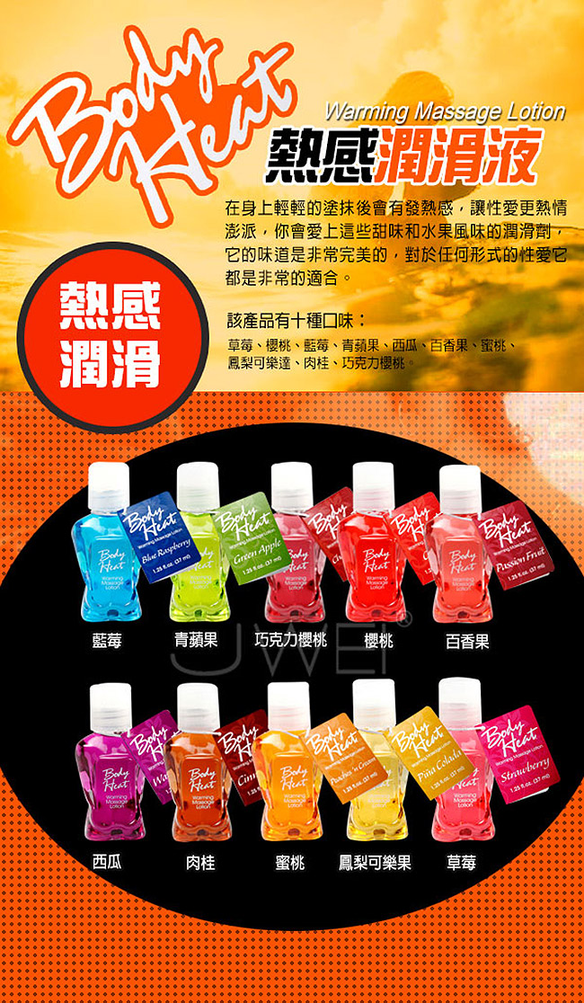 | 可愛小巧身體造型的瓶身,讓人愛不釋手,擠出些許按摩油塗抹在身上輕輕摩擦後會有發熱感,還會散發出香甜的水果風味,觸覺 嗅覺的剌激外還可舔舐,可以把 按摩油塗滿全身,用舌頭慢慢的挑逗對方,讓性愛前戲更熱情澎派,你會愛上這些水果風味,它的味道是非常完美的,對於任何形式的性愛都非常的適合。