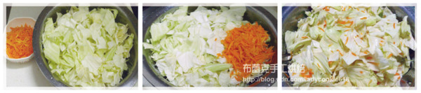 1.高麗菜洗淨切小塊,紅蘿蔔刨絲備用。