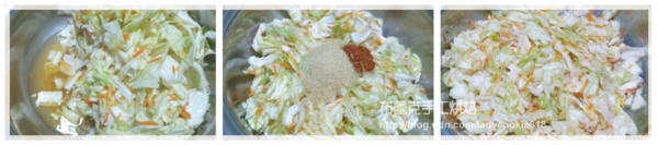 2. 將鹽倒入高麗菜與紅蘿蔔絲中,混合均勻放置2個小時,等高麗菜自然出水。