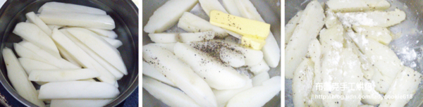 2. 煮好後把水瀝乾,趁熱加入奶油,稍微搖晃鍋子好讓奶油溶化沾附在馬鈴薯表面,