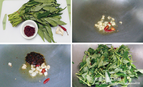 1. 空心菜洗淨切大段,蒜頭切片、辣椒切段備用。