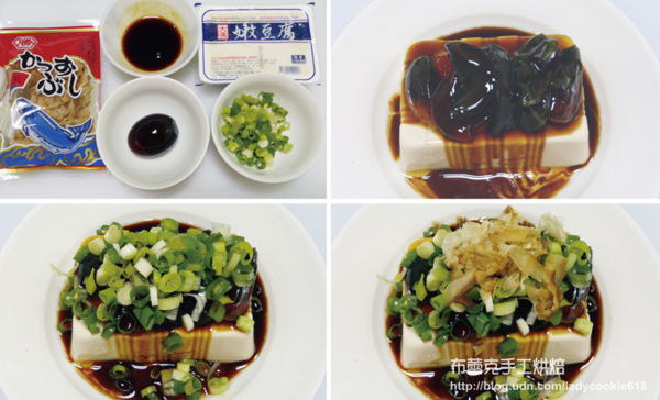 2. 嫩豆腐擺盤,放上皮蛋、淋上調好的醬汁。