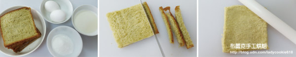 1. 吐司去四邊,用桿麵棍壓扁備用。