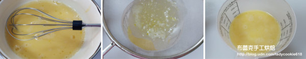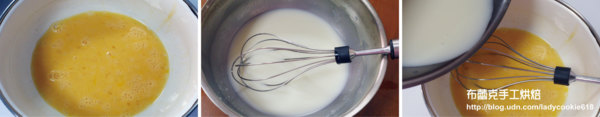 3. 雞蛋打散,慢慢加入微溫的牛奶液,一邊加一邊攪拌均勻,用濾網過濾備用。