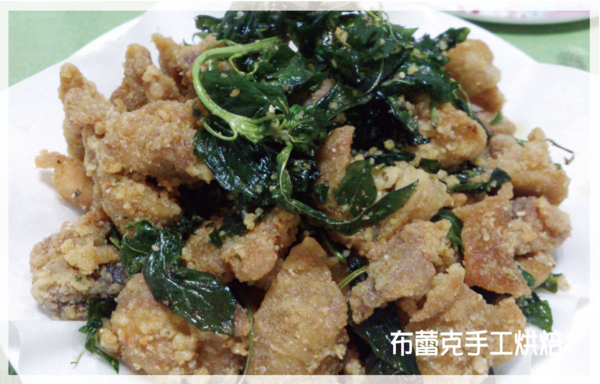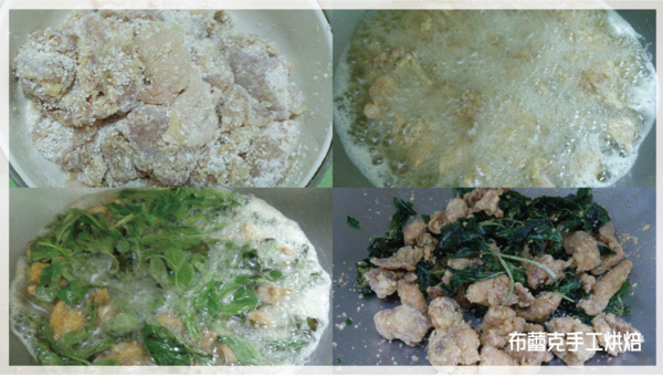 5.將油再燒熱,放入雞塊,以大火炸約30秒至外表酥脆,起鍋前再放入九層塔一起炸一下撈起。