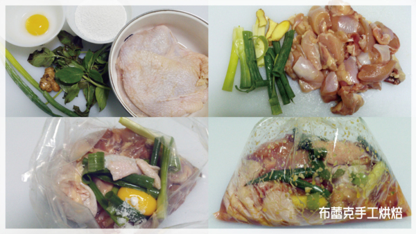 2.雞腿切成3公分大小塊狀,放入塑膠袋,加入蔥末、薑末和全部醃料、醃30分鐘。