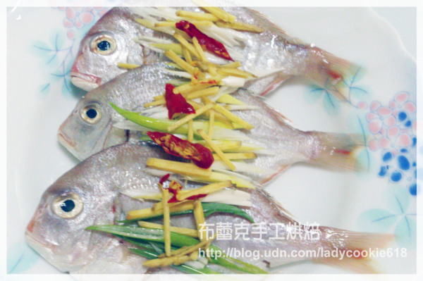 4. 將薑絲、辣椒絲和一半蔥絲均勻鋪上,包上保鮮膜,電鍋外鍋1杯半~2杯的水蒸熟。