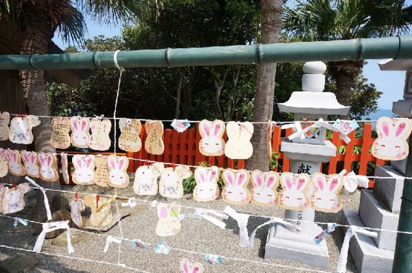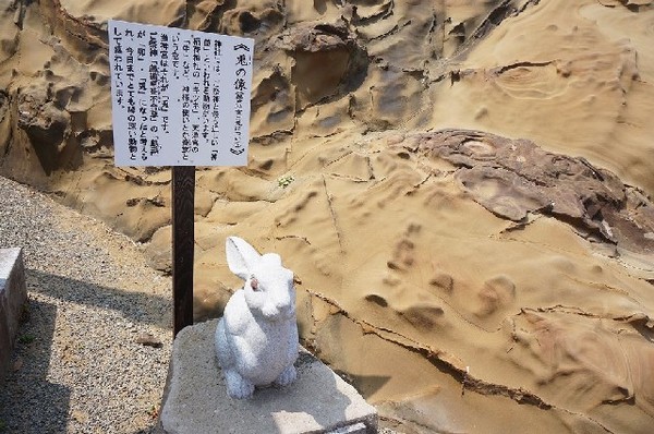鵜戶神宮的吉祥物是兔子,五福旅行社導遊解說兔子也算是神的使者,而且摸兔子可以得到好運,達成願望。