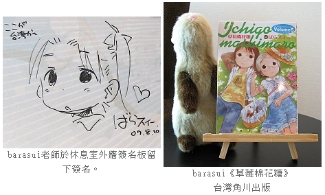 蘿莉派超無厘頭搞笑漫畫《草莓棉花糖》,描寫16歲的高中女生伊藤伸惠以及三個國小高年級小女生間輕鬆的日常生活,既通俗又可愛而且帶點脫線的漫畫!!這部萌系作品高評價的《草莓棉花糖》作者barasui老師應此次台灣角川出版社之邀,來台參與動漫界的盛會-漫博會,並於會場舉行簽名會,讓漫迷們一賭老師的真面目。老師相當地年輕,今年27歲的老師就像是個有點害羞的大男生。