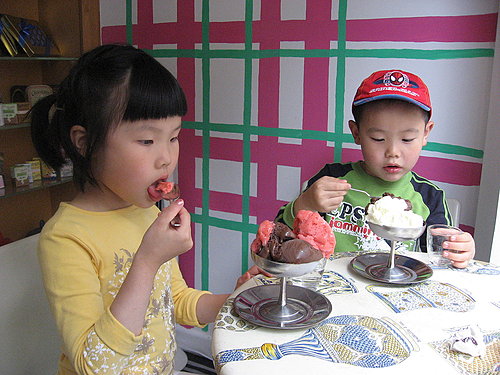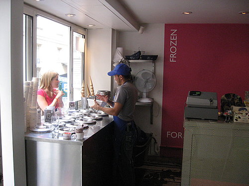 光從服務人員於冰桶中用刮鏟以不規則方式而非球狀舀出冰淇淋,