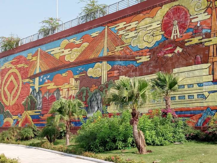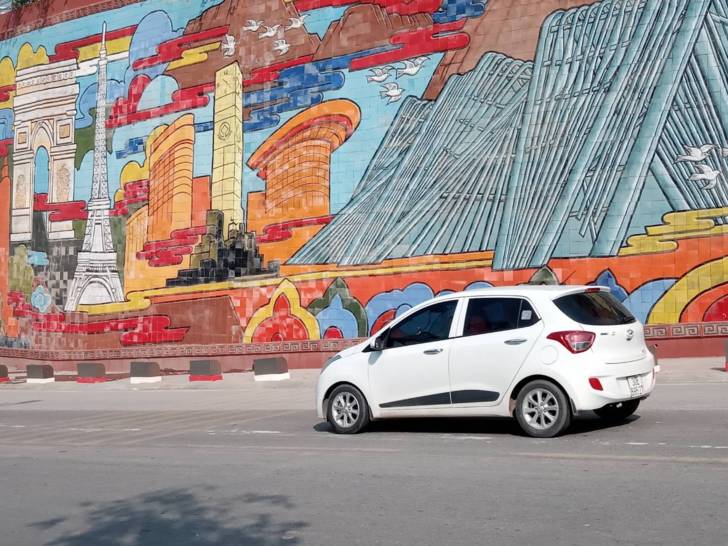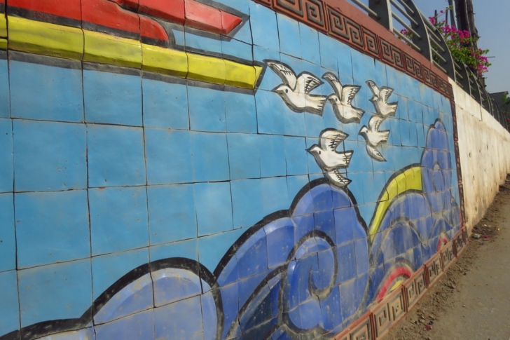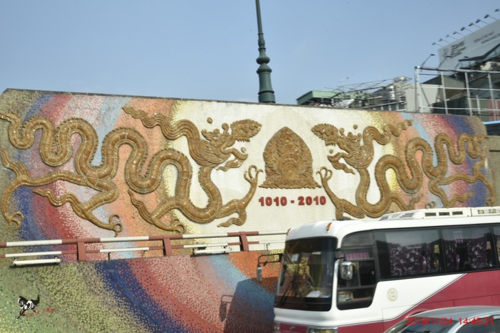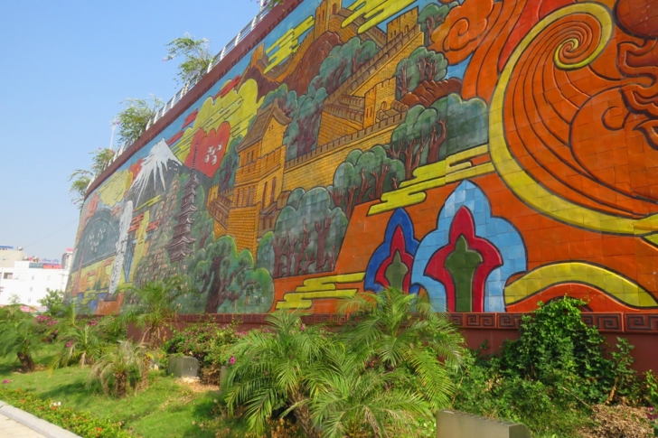 嚴格說,河內不是座美麗的城市,就像許多發展中城市一樣,伴著快速發展帶來雜亂和繁忙。河內市區臨著紅河,就像台北市一樣,為了防範河水氾濫,沿河修築了高高的堤防,但是堤防上卻多了許多彩繪,讓雜亂的市區多了不少色彩。我們坐著遊覽車匆匆走過,沒來得及細細觀賞這些彩繪。不知郭兄是從那兒借來了空檔和時間,拍了好些張美美的照片,就在這兒借用一、二吧!(註:後來才知道,原來郭兄和筆者一樣也看到了這些壁畫,只是郭兄更用心的記下道路方位,趁著要回台北那天一大早的一點兒餘裕時間,從旅館繞行市區好大一圈,找到了這些壁畫,也拍了照。只是據說回程差一點兒迷了路。因為郭兄的用心,才讓筆者能「借用」這些美麗又特別的壁畫照片,真是萬分感謝。)