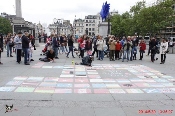從教堂出來,轉到Trafalgar Square,這裡人多自是不在話下。我們只想經過,並不打算久留。就在走過廣場一角時看到一位街頭藝人在地上畫了一幅又一幅各國的國旗,每面國旗上或多或少的散置著一些硬幣,想是遊客打賞的吧。旁邊還寫了幾個大字「Peace and Love」。仔細一瞧,青天白日滿地紅的國旗赫然在焉,卻只放了一枚小小的硬幣。輸人不輸陣,趕緊掏掏口袋,拿了些硬幣給補上。說來這作者也是聰明,過客們怎能就這樣讓自家的旗幟上空空如也呢。雖說是明知如此,卻也是甘心的放下硬幣。