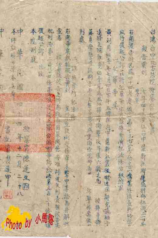 為了那個黃姓婦人的趨趕,我的兒子受了如此傷害,從台北回來曾去找她理論,奈何她仍是一副趾高氣昂的樣子,毫不認錯。不得已,只好去警察局報案,不為別的,只為了怕這個兒子從此殘廢怎麼辦。在警察局作筆錄時,這位黃姓婦人仍不承認是她的掃帚把我的兒子打倒,摔斷手臂,警察局只好把案子移到法院。檢察官收到案子後,也認為縱使沒有直接打到人,但丟擲掃帚趨趕孩童,致跌斷手臂,仍有因果關係,於是在民國四十四年十二月二十八日,以「被告之所為既有因果關係,委難辭過失刑責,核被告實犯刑法第二百八十四條第一項後段之罪,合依刑事訴訟法第二百三十條第一項提起公訴。」