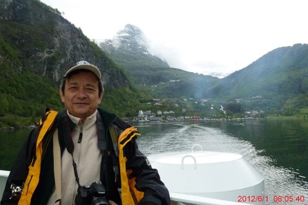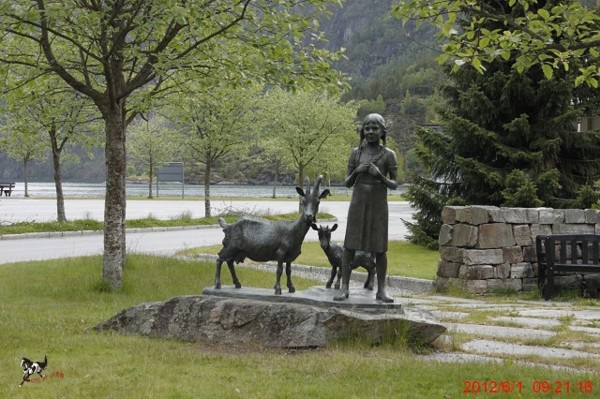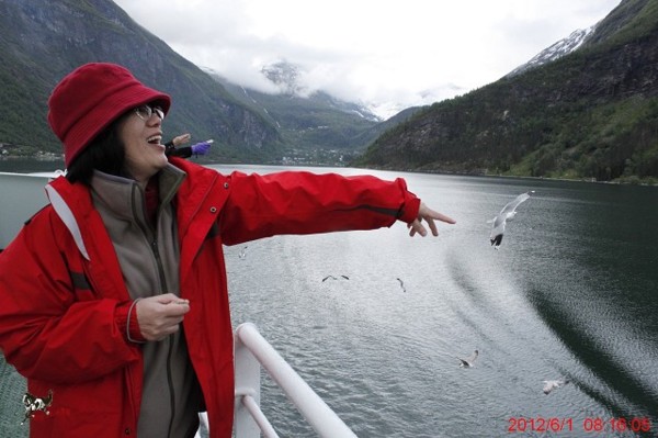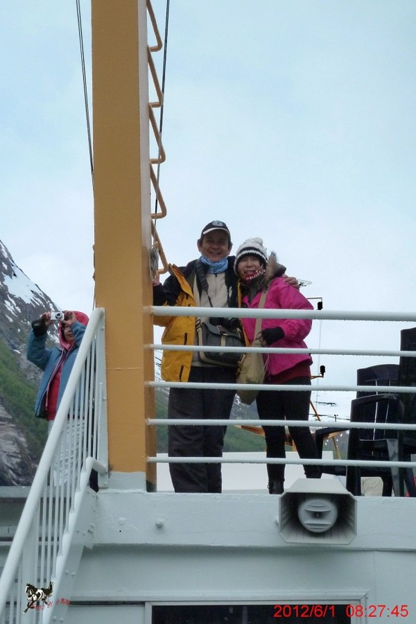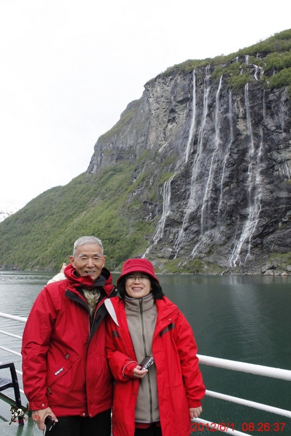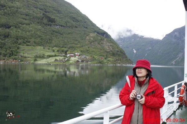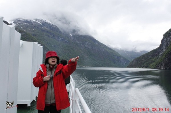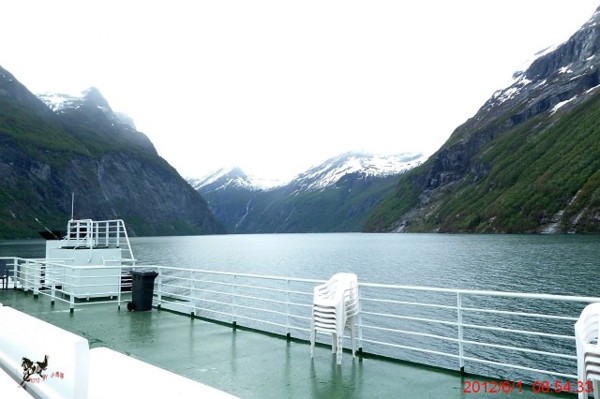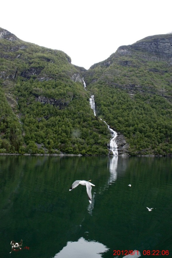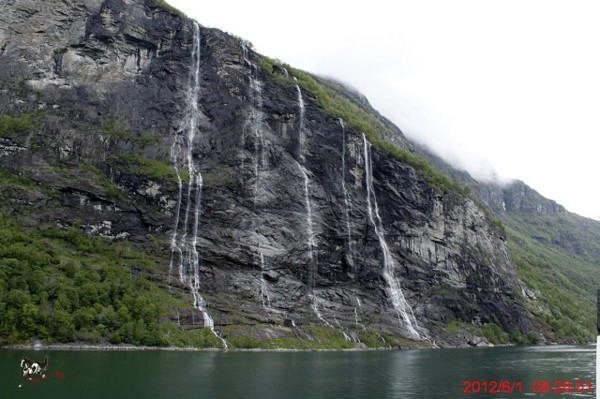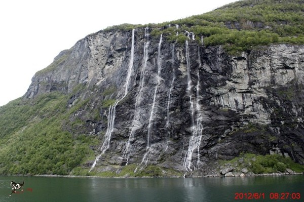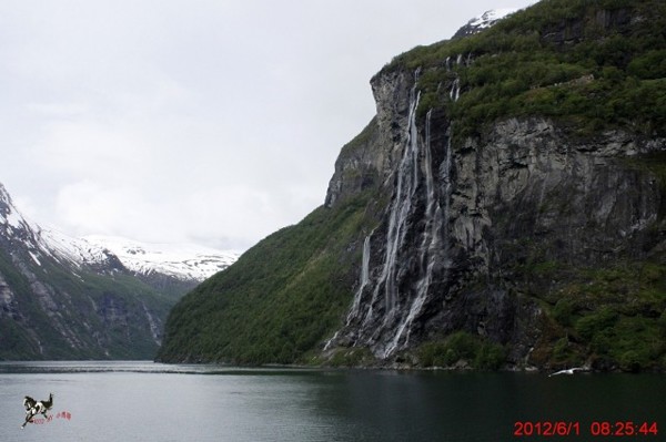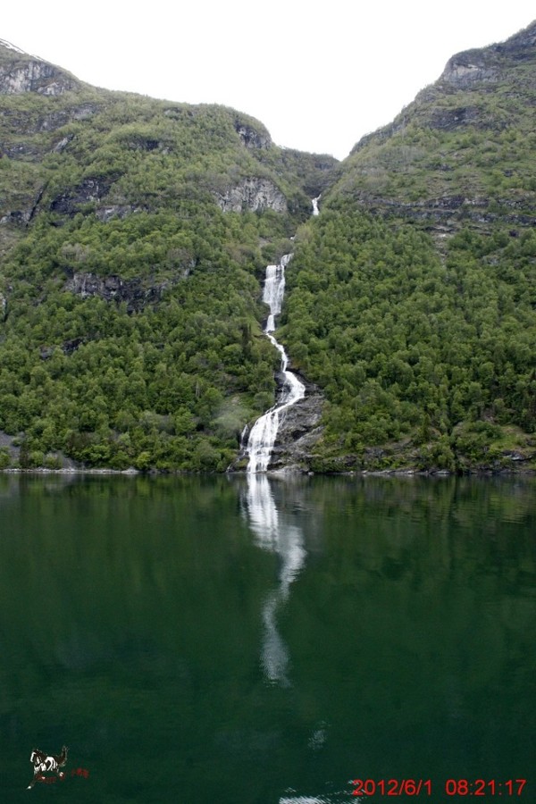 Geiranger峽灣水深近300公尺,沿岸都是高約1,000公尺的山峰、岩壁,這種地形想必是多瀑布的。整個峽灣裡就有三個比較有名瀑布。渡輪經過了老鷹之路沒多久,轉過藍色深沉的水域,左前方岩壁上一排細長瀑布從山頂排流而下,這就是有名的七姊妹瀑布(Seven Sisters)了。峽灣對面,與七姊妹瀑布相對的則是一縷細細長長、從山頂蜿蜒而下的求婚者(Suitor)瀑布,這個瀑布也被叫作化緣修士(The Friar)。這是個想向對面七姊妹求婚、還是想向她們化緣的修士呢?兩個名字也差太多了吧。如果把它名之為「董永」瀑布或許比較合咱們的意吧,「七仙女配董永」該是多麼巧妙的組合啊!只或許是水量不足,我怎麼算也算不出七個瀑布來,另外的姊妹想必是出遊去了。