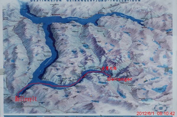 從Geiranger出發的渡輪有兩條路線,一是Geiranger-valldal線,另一是Geiranger-Hellesylt線。前者可以往北接回到63號公路,走這一路線或許可以回去走一趟Trollstigen。但與我們的路線背道而馳。後者則可以銜接我們往後的行程。