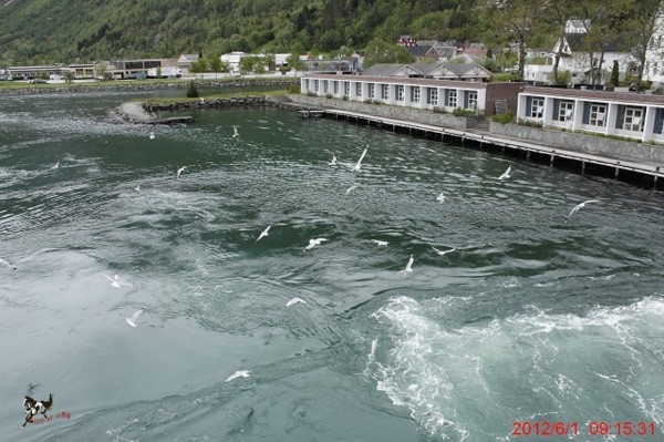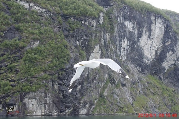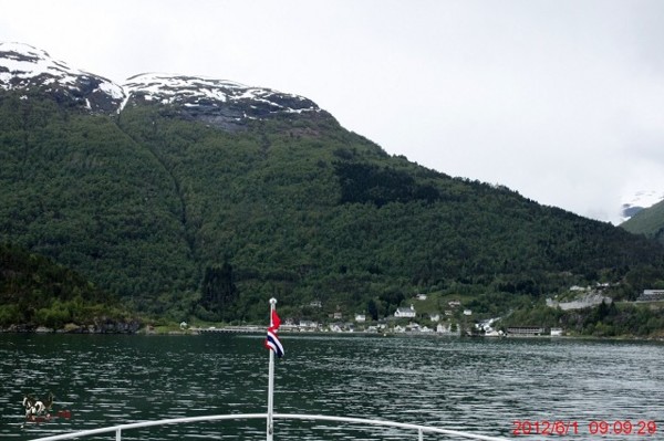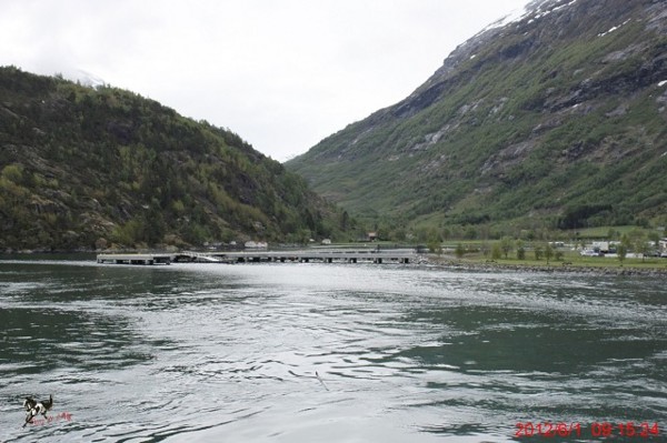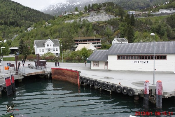 經過一個多小時的航程,離開Geiranger不久就消失了的海鷗再度開始在船舷上空盤旋,表示離岸近了。果不其然,前方Hellesylt碼頭在望。
