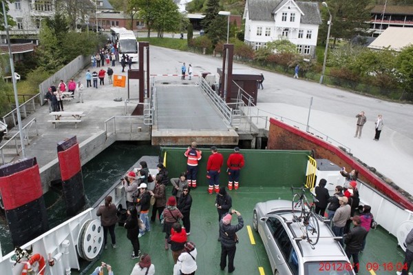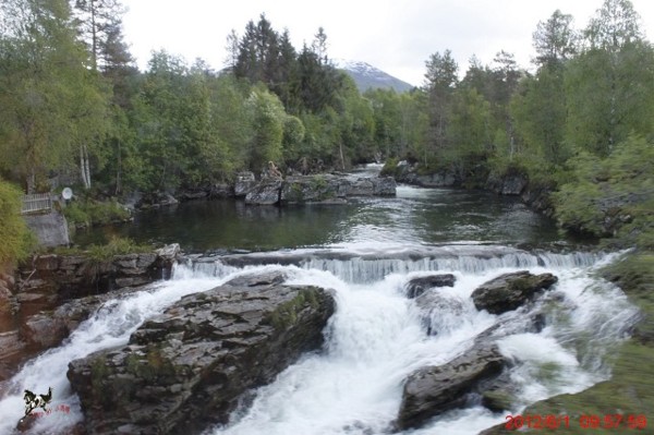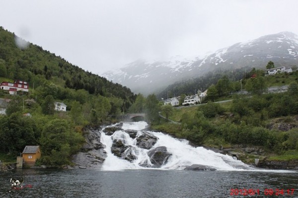 從碼頭乘車下了渡輪,轉過一座窄窄的橋樑,這裡有一個冰河融雪溪流流經砂岩形成的瀑布(Hellesyltfossen)吸引了大家的目光。似乎經過這裡的遊客都必須在窄橋上和瀑布留影才算到過此地。
