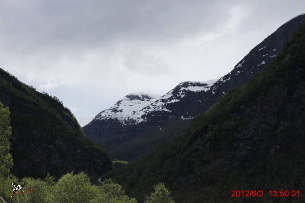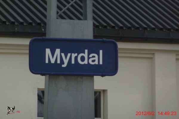 上了車,繼續上行,穿過889公尺、建在落差有數百公尺高懸崖邊上,以人工擋土牆保護的Vatnahalsen Tunnel後,鐵路在這裡作了一個長達880公尺、馬蹄形的大轉彎。之後,再經過幾座隧道,列車又停了。原來是海拔866公尺、Flåm Line的起點站Mysdal到了。
