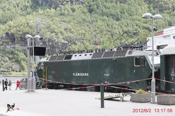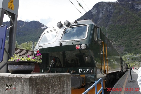 在Flåm下了車,走過紅色的車站建築往前望去,鐵道上一列由編號「17 2227」和「17 2229」的兩個「El 17」電力機車頭一前一後牽引和推進的綠色列車正等著我們呢!