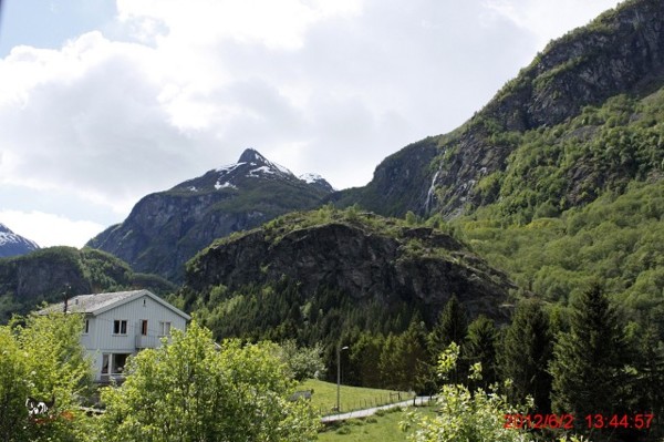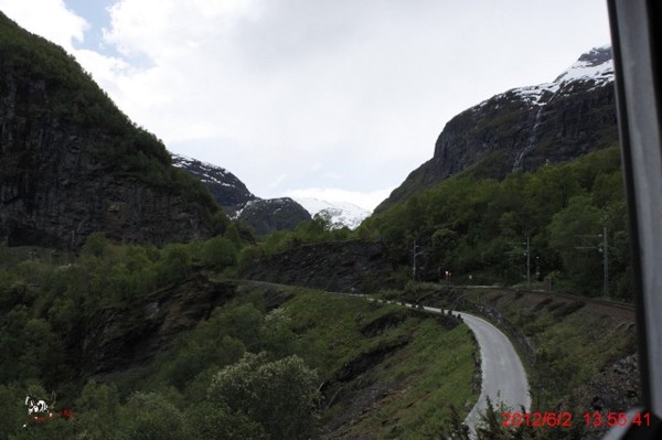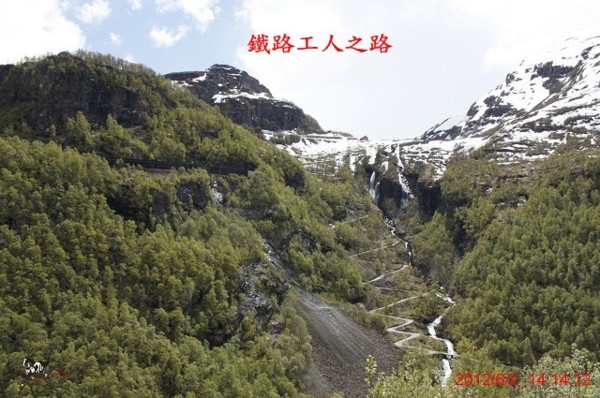 再從這裡經過Dalsbotn站,穿過幾座隧道就是這條鐵路唯一跨越河流的Høga Bridge。再往前走,就是海拔344公尺、唯一可以錯車的Berekvam站。由這裡往上行大約20多分鐘,穿越最長的1,341.5公尺的Nåli Tunnel,右方山谷呈一個大弧形,山壁上一條之字形的山路迂迴而上,那是辛苦的鐵路工人路。想想這裡海拔將近650公尺,由山谷向上高低差至少也有3、400公尺吧,要從谷底往上走還真是不輕鬆呢!