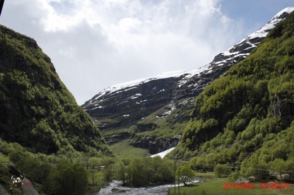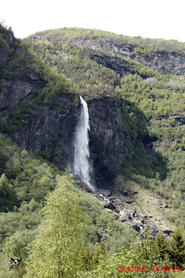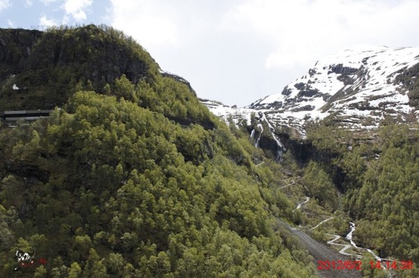 Flåm Line既然是高落差,又在山嶺中盤旋的鐵路,當然除了山嶺、隧道之外,一定少不了瀑布囉。才出發十來分鐘,右邊山上就出現一條上頭細長、下面粗壯的瀑布。走著、走著的,火車過了第一座長424公尺的Furuberget Tunnel,右邊對面山頭上一道白練從天而降,那就是從310公高的山頂落下、中間垂直部分落差達140公尺的Rjoandefossen瀑布。