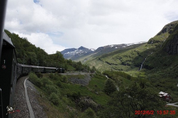 火車離開Flåm車站不久,就開始往上爬行,2.8%到5.5%的坡度算是相當陡峭的,但是大夥兒搶著在部分可以拉開的車窗前拍攝外面美麗的風景,陡坡,早就不知道被拋到那一國去了。