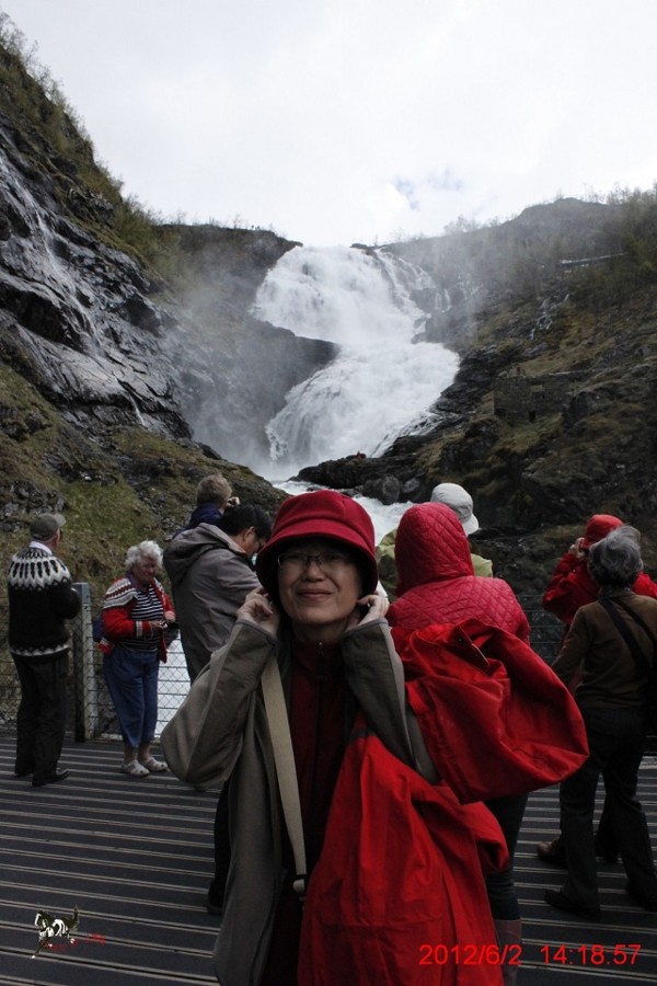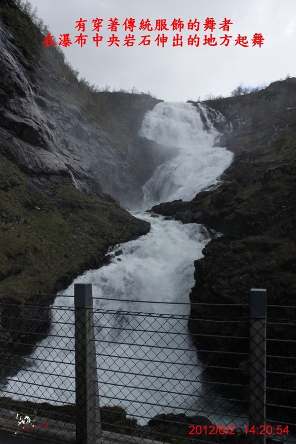 舞者在平台上跳的舞蹈叫作Huldra。Huldra是北歐的民間傳說裡的一種具有魅力的森林動物。Huldra女演員則是來自挪威芭蕾舞學校的學生。或許也因此讓此地成為最吸引觀光客的必訪景點吧。只可惜距離太遠,來不及更換長鏡頭,所以沒能拍下舞者美妙的舞姿,只好在瀑布前留影作個紀念了。