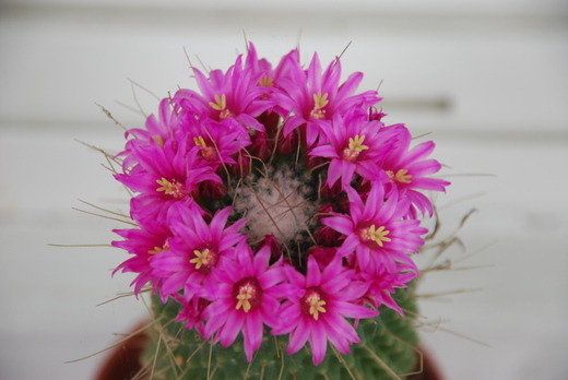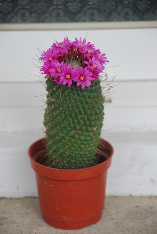 「仙人掌會開花嗎?」同事經過辦公室,瞥見窗台上一株小小的仙人掌狐疑的說。是啊!仙人掌會開花嗎?它渾身不是長著尖尖的刺嗎?我也好奇的走到窗外一看,果然仙人掌開花了,奇特的外表長著一輪鮮豔的花朵,好像頭上戴了美麗的花冠。 這株仙人掌是什麼時候什麼地方買的已經忘了,只記的聽說仙人掌可以吸收輻射,所以買來放在辦公室電腦旁邊。去年夏天因職務關係換了辦公室,一箱一箱雜七雜八的東西還真不少,整理時順手將這株仙人掌擱在窗角下,就這樣每天經過窗前都視而不見,甚至忘了它的存在,當然也忘了是否曾經澆過水。