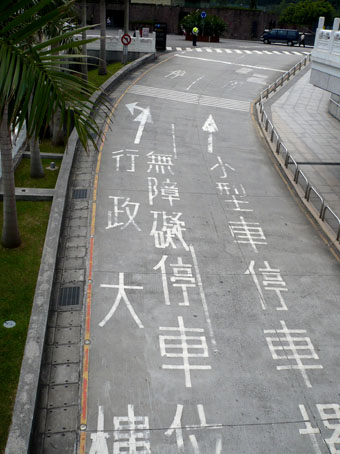 2006年展館動線改建之後,NPM多了這條弧形車道,可能是因為行政大樓前的廣場幅員開闊,雖然畫出明顯的人行穿越道,但真正走在上面的人卻不多見。最常見的情形,是人車混行,造成執勤員警的莫大困擾.....