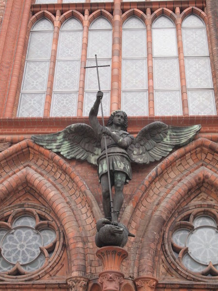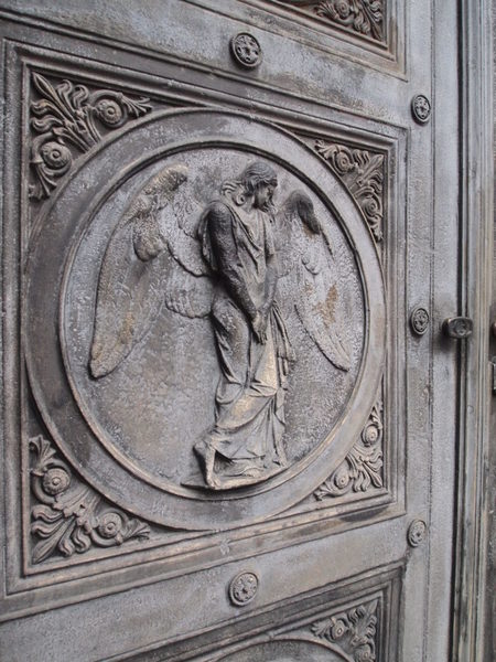 大門上立著一位腳踩巨蛇(應該是吧)的天使。