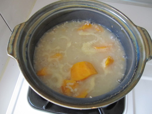 我在斗大的灶腳煮食紅糖老薑地瓜湯、豆漿、現採的地瓜葉當早餐。每天用陶鍋為母親熬煮地瓜稀飯,陶鍋能夠保溫,把溫度燒高再轉小火慢墩,溫度依然維持不變! 當米飯地瓜熟了以後,馬上使用大火收斂多餘的水分,這時一鍋稠稠黏黏的稀飯番薯糜就完成了。
