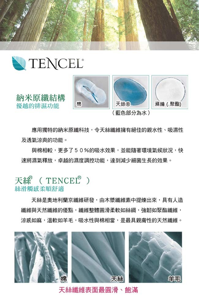 表/底布:50%萊賽爾(天絲) + 50%超細聚酯纖維 (3M專利吸濕排汗處理)