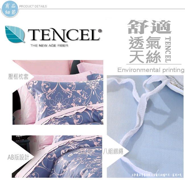 床包/枕套:50%萊賽爾(天絲) + 50%超細聚酯纖維