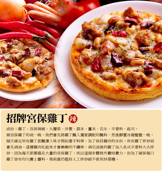 厚皮-招牌宮保雞丁:麵粉、糖、鹽、發酵粉、迷迭香、洋蔥、甜椒、義式香料、雞丁、辣椒、洋蔥、起司