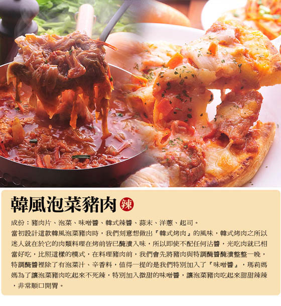 厚皮-韓風泡菜豬肉:麵粉、糖、鹽、發酵粉、迷迭香、洋蔥、甜椒、義式香料、豬肉、泡菜、味噌、起司