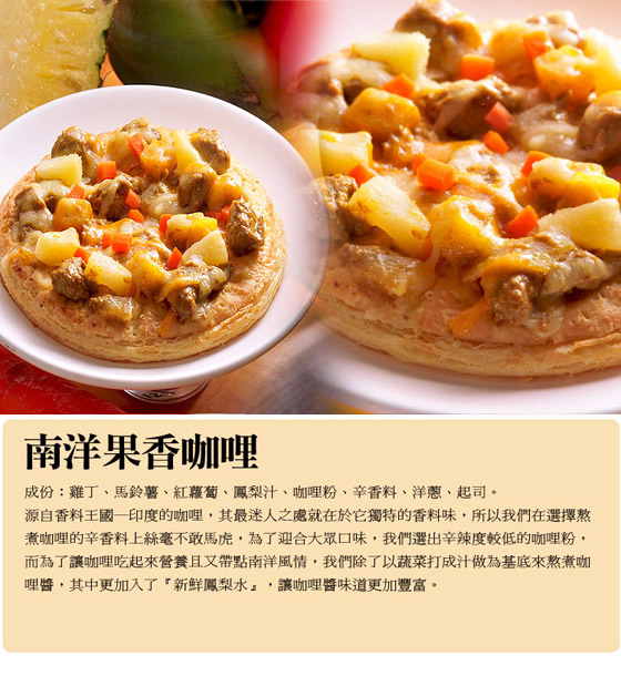 厚皮-南洋果香咖哩: 麵粉、糖、鹽、發酵粉、迷迭香、洋蔥、甜椒、義式香料、雞丁、薯泥、咖哩粉、起司