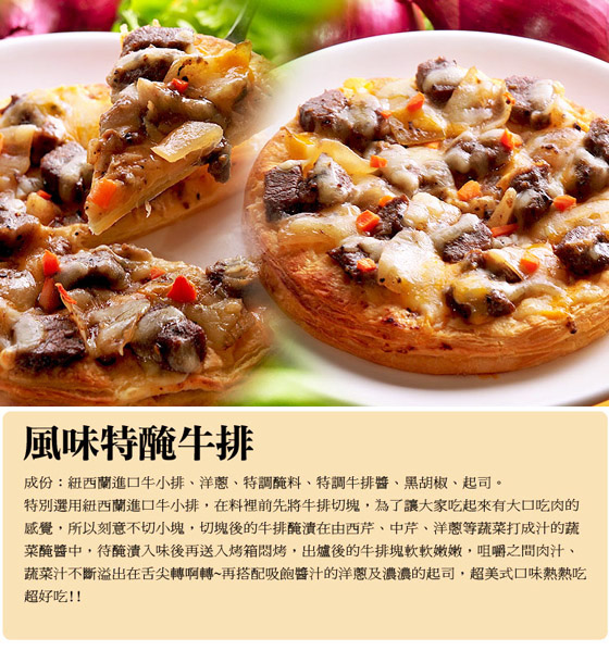 厚皮-風味特醃牛排:麵粉、糖、鹽、發酵粉、迷迭香、洋蔥、甜椒、義式香料、進口牛小排、黑胡椒、起司
